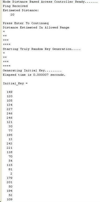 Inthisabovefigurewecanseeestimateddistance and initialize key. Above figure shows that node is in convergerange,sonodedistance-basedaccesscontrolleris ready for establish connection between node and access controller,becausepingisreceivedatdistanceof19meter. So,accesscontrollerprovedinitialkey,generatedinitialkey wecanalsoseeinabovefigure.