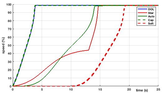 Fig. 10 shows graphs of starting torque with time for all the starting methods. Both Capacitor and DOL starting methods have similar torque characteristics. The starting torqueofstardeltais30%oftheratedtorque.Thetorque ofDOLandstardeltarisessharplytothemaximumtorque with in 4s and 14s respectively. The corresponding starting torque for autotransformer method is approximately 10% of the rated torque; this increases graduallyto165%at13softhefullloadtorquewherethe autotransformer is taken out of circuit. The resulting graphsofspeedwithtimeforallthefivestartingmethods are shown in Fig.11 The speed of DOL and capacitor start reachestheratedspeedwithin3swhileittakesabout18s for electronic softer starter to reach the rate speed. Star delta starter and autotransformer starters takes almost thesametimetoreachtheratedspeed