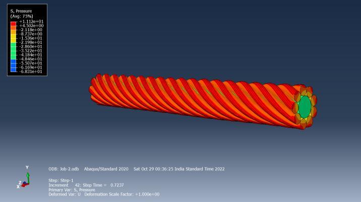 Figure 7 and 8 represent the Von Mises stresses and the pressure on the twisted rope. Von mises is maximum in central rope, whereas pressure is maximum in peripheral rope.