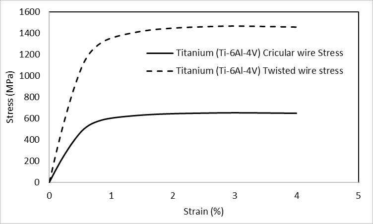 Figure 10 represents the stress vs strain behavior of Ti6Al4V alloy for a circular and twisted wire case. Here also, just like steel, it can be seen that young’s modulus is higherinthecaseoftwistedwire.Despitelittledifference between the yield and tensile strength for circular and twisted wire stress cases, the yield strength (and also the tensile strength) of the twisted wire case is three times thatofthecircularwirecounterpart.