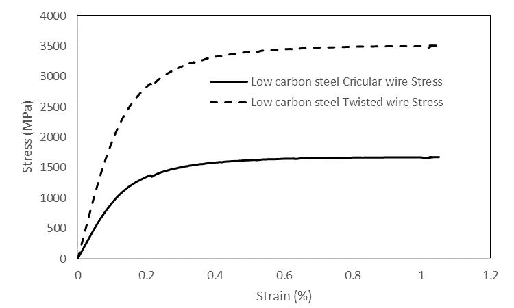 Figure 9:Stress-strainplotoflowcarbonsteelcircular wireandtwistedwirestress