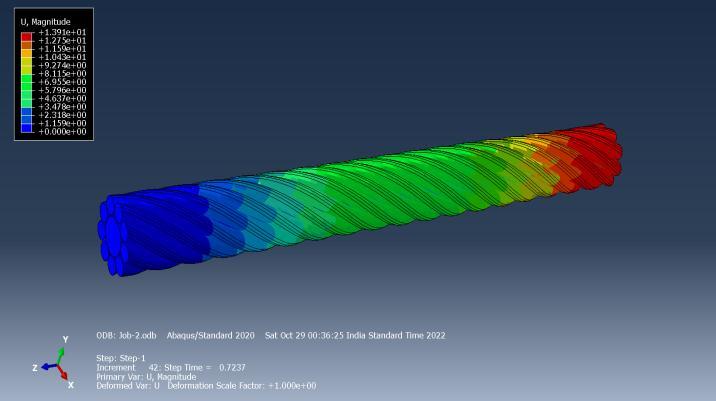 The color-coded FEM simulation results of the displacement of the twisted rope are represented in Figure 5. It can be seen that the displacement decreases along the length of the wire. Maximum displacement is observedontheright-handsidewheretheloadisapplied, andzerodisplacementisobtainedonthefixedend.