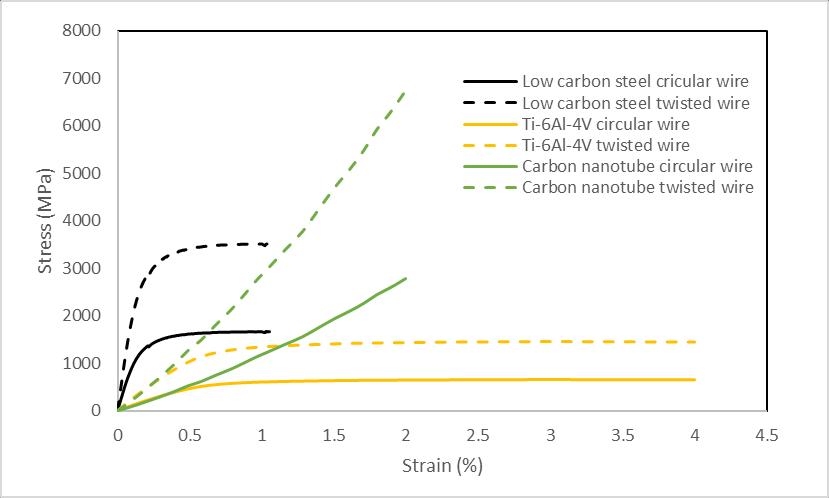 behaviorforthetwistedwirecaseisalwaysonthehigher sideirrespectiveofthechoiceofmaterialbutaddingto it, carbon nanotube exhibits the highest strength as comparedtotheotherchoices.Onthe other hand, Ti-6Al4Vexhibitsthebestductilitybutthiscomeswithapenalty on its strength. Low carbon steel is quite a balance between both strength and ductility as it exhibits an optimal combination of both better tensile strength and reasonableductilitytillfracture.