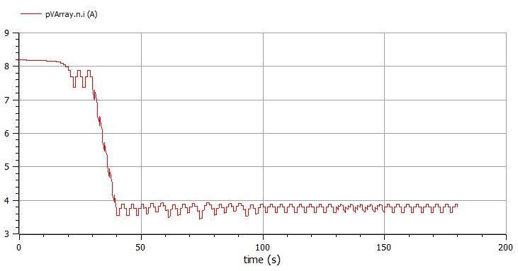Figure(9)andfigure(10)exhibitthecurrentandthevoltage ofthephotovoltaicarray.Itisclearthatwhentheirradiation conditions change, the current increases (or decreases) significantlyandthePVoutputvoltagechangesslowly.