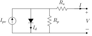 OneofthetraditionalwaystomodelaPVsourcedefinedin thiswayistousetheequivalentcircuitpresentedinFigure (2).Thisisknownasthesingle-diodecircuitmodel of the solarcell.Atwo-diodemodelalsoexists,butthesingle-diode version provides a decent approximation and is simpler [VGF09].Therelationshipbetweenthevoltagesandcurrents inFigure(2)canbeestablishedintheformofthefollowing equation: