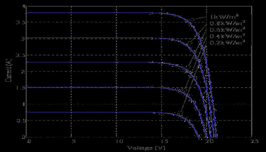 Figure (3) shows the I-V characteristic curves of a photovoltaic cell at a constant ambient temperature but differentradiationlevels.