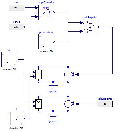 The system is simulated using Modelica is shown in Figure(8),theinputofPV-moduleblockisVa(PVvoltage), Suns(irradiation),andTaC(operatingtemperature).