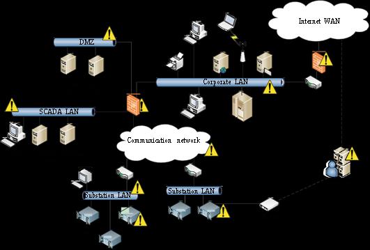 Fig.5 represents an outline of potential targets for cyber attacks(indicatedbyyellowexclamationmarks) on the communication infrastructure of SCADA frameworks [1]. The primary issue in most of the existing systems derives from the fact that SCADA frameworkswerenotintendedtobeassociatedwith theexternalorganizationfoundationandthussecurity perspectives were not considered during the development phase [1]. The messages that IEDs exchangewiththeoutsideworldareoftentransmitted overcommunicationchannelsthatarepotentiallyopen toeavesdroppingoractiveintrusions[1].Anenormous possible threat to these frameworks is gotten from unauthorized users on the corporate channel or any othernetworkthathasanassociationwiththeSA[1].