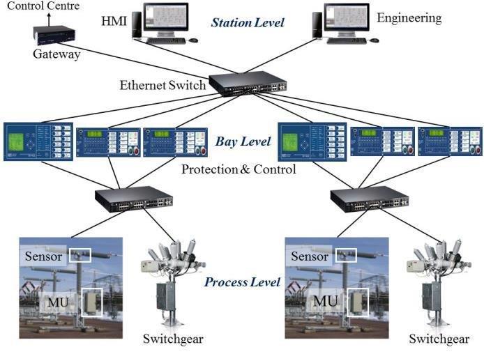 Theprocesslevelconsistsofallsubstationdevicesthat are routed with copper cables and connect bay level IEDsusedforcontrolandprotectionusingfiberoptic cables[19]