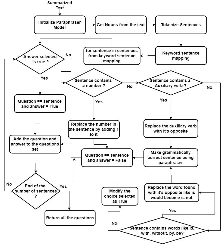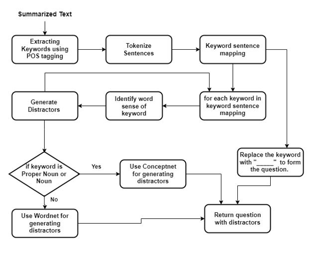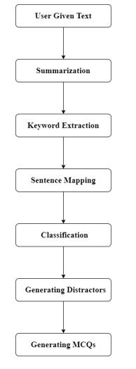 Thesystemwouldanalyzethetextbysummarizingthetext using the âBERT State of Artâ language model algorithm. Besides,all the watchwordsfrom the summarizedcontent areextractedusingPOStagging.AtthatpointtheSentence Mapping is done by extracting the sentences for each keyword. Within the Sentence Mapping, all the sentences fromwhichMCQsaretobeshapedareextracted.Sincethe systemisnâtfairlykepttoonesortofMCQ,thusclassification isanimportantstepofthesystem.Allthesentenceswhich were extracted within the Sentence Mapping phase are classifiedhereaswhichsortofMCQshouldbeshapedfrom whichsentence.Andafterthatbasedonthesortofsentence classified,comparingDistractorsarecreated.Atlast,different techniquesareusedsothattheuserwouldgetsyntactically correctMCQs.Thestepscarriedoutbythesystemareshown inFig 1.