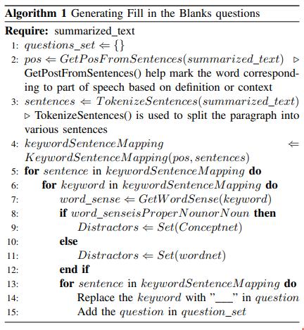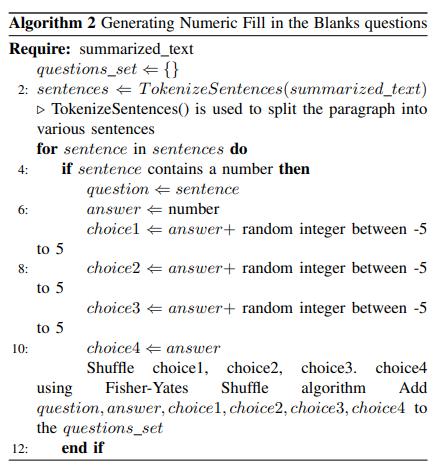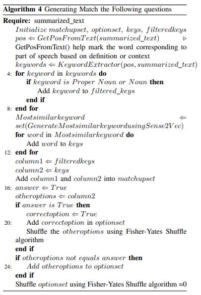 âSense2Vecâisappliedtogeneratethemostsenseoptionsfor the filtered keywords as column 2 to match the following pattern, ensuring to find the most identical word for the filteredkeywords.ForExample:âmostsensewordforforest iswoodslikewiseforpawsisbackfeet.âFramingthecorrect option first, then the other distractors. To begin with, the generated choicesare a,b,c,dand used the loop to find the appropriate option, i.e., the correct value for the filtered keyword, and assigned the random choice, ensuring that otherkeywordsareassignedtootherchoices,andrepeated thisprocessfortheotherfilteredkeywords.Forexample: âwoodsgetsthechoicedasarandomchoicethentheback feet will be assigned to another choice but not d as it is alreadyassignedâ.Aftergeneratingthecorrectoption,other distractors are generated. Finally, the Fisher Yates Shuffle algorithm is used to shuffle these distractors so that the outputisnotadefinitechoicebutratherarandomchoice.