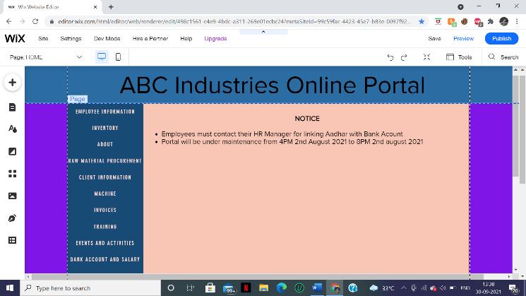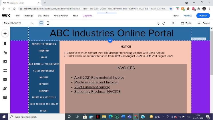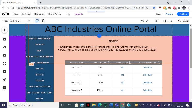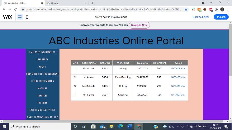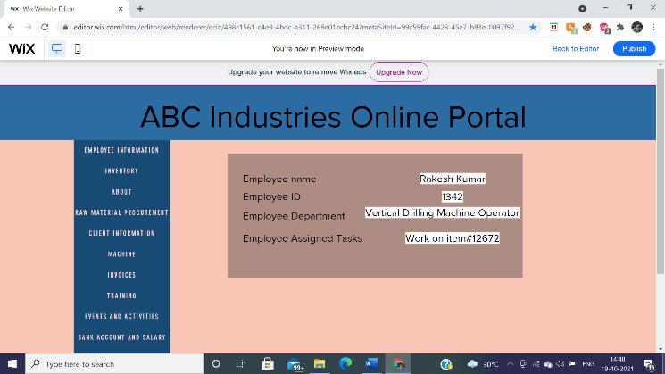 Amicroenterpriseisanenterprisewhereinvestmentinplant andmachinerydoesnotexceedRs.25lakhs.Duetofinancial constrainttheinvestmentonERPpackagedevelopmentand training needs to be minimal. Web based ERP solution is foundtobesuitableforsmallbusinessesasitcanbeaccessed remotelyfromanywhere.Theyarealsoeasytomaintainand offer trouble free installation and upgradation. Website is designedusingWIXEditor.Itisafreeuser friendlyplatform for webpage development without the knowledge of any coding skills. WIX also offers pre built templates and elementswhichmakesitveryaconvenientandhassle free process.Thewebpageuserinterfaceismadelightweightto reduceunnecessarydataconsumption.Thewebpageismade tobeaccessiblebyauthorizedpeopleonlywheretheycan loginusingtheirEmployeeIDandpassword.Allthefeatures aredisplayedasTabsontheleftsideoftheweb pagemaking it easy for the users to navigate through the website. The website displays Notice/upcoming events in the spotlight section. The website portal stores employee data such as Department,DesignationandCheckin outtime.Theportal alsolinksemployeebankaccountandsalaryslip.Thewebsite proves to be very beneficial in handling invoices and inventories.Therearevarioustypesofmachinerydeployed in an heavy industry and managing them can prove to be quite complex. The website offers critical machine information such as machine name, type and maintenance schedule. A successful enterprise always focuses on continuouslearningandimprovement.Trainingmodulesand ERP user guides are integrated within the portal system whichcanbeaccessedbytheemployees.
