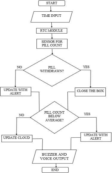 The IR sensor is employed in the suggested model to sense the patient's movements, and when it detects the motionofthepatient'shand,itdecreasesthepill countby one. If the sensor senses the patient's hand and the pill is withdrawnitclosestheslotoftheboxelse,itwillupdatethe patientortheprimarycaretakerwithanalert.Thisprocessis continuedeachtimeaccordingtothetimeallottedbasedon theprescribedtimetotakethemedication.Ifthepillcountis belowtheaveragevaluedefined,itupdatesthecaretakeror theuserwiththealertelse,itupdatestheclouddata.Here, thesystemusesabuzzerandvoiceoutputtoalerttheuser for the intake of medication. It also solves the problem of