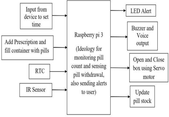 Theproposedmodel'sblockdiagramisshowninFig 2. When the user's device and the Medi Box establish a connection,thesystembegins.TheRaspberryPi 3createa link.Thedeviceprovidesinputtothebox,allowingittoselect thetimeatwhichalarmsmustbenotifiedinaccordancewith the prescription. When the date and time match the predetermined time,analarmistriggeredtoremindpatients totaketheirmedicineattheappropriatetime[12].AnRTC RealTimeClockmoduleisusedtomonitorthetime;thedate and time automatically run from the calendar specified initially,andwhentheymatch thepredeterminedtime,an alarmistriggeredtoremindpatientstotaketheirmedicine attheappropriatetime. An IR sensoris used tosense the motionoftheuser[13].TheIRsensoremitsIRradiationand iftheradiatedsignalreflectstothereceiver thentheoutput ofthesensorcanbedecidedbytheIRreceiverdependingon theintensityof theresponse.Whenitsensesmotionorheat intheuser'shand,itproducesanoutputthatmonitorspill withdrawalwhilesimultaneouslyloweringthepillcountby one,andtheprocedureisrepeatedeachtimemedicineisdue. Hence it is used to monitor the count of pills. And the problemof keeping a track of the number of pills is also solved.Italsogivesanalerttotheuserifthecountislow.