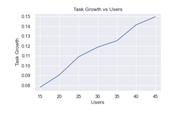 Thefigureshowstheaveragetaskgrowthpercentagewith respect to the number of users, it can be seen that as we increase the number of users the percentage of tasks completed increases. It should be noted that it is not the differenceintheaveragetaskbeforeandaftertrainingbut itspercentage.Thusitcanbescaledonthesamegraph.