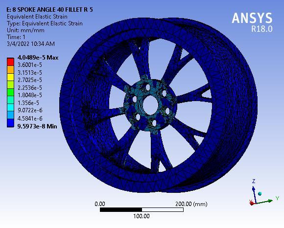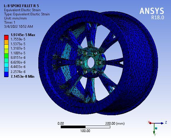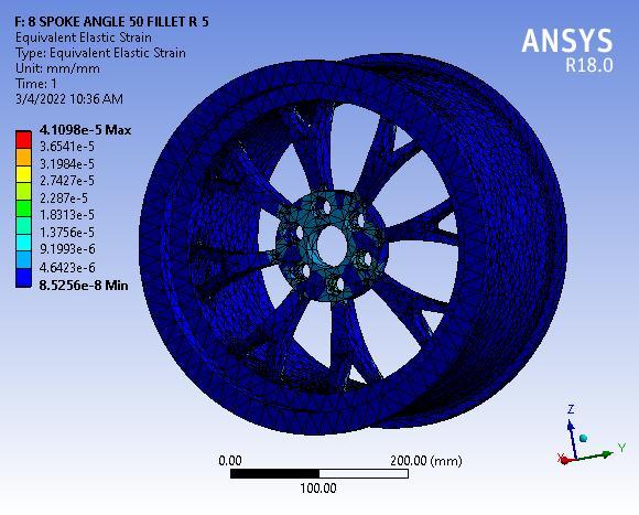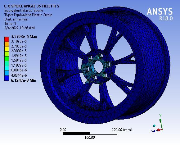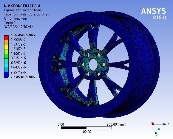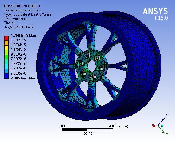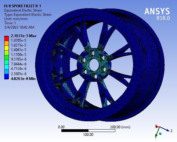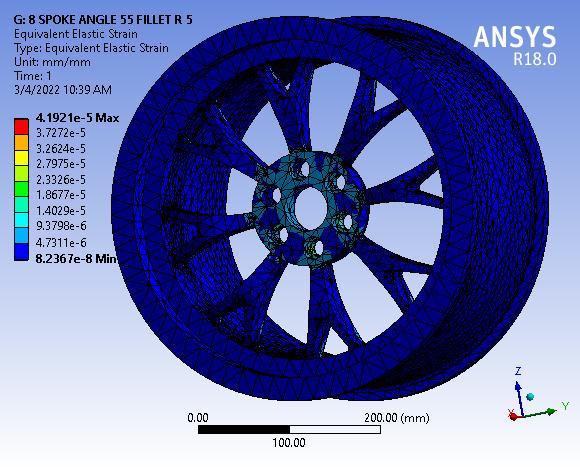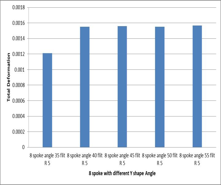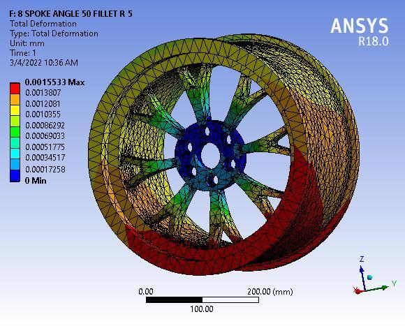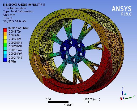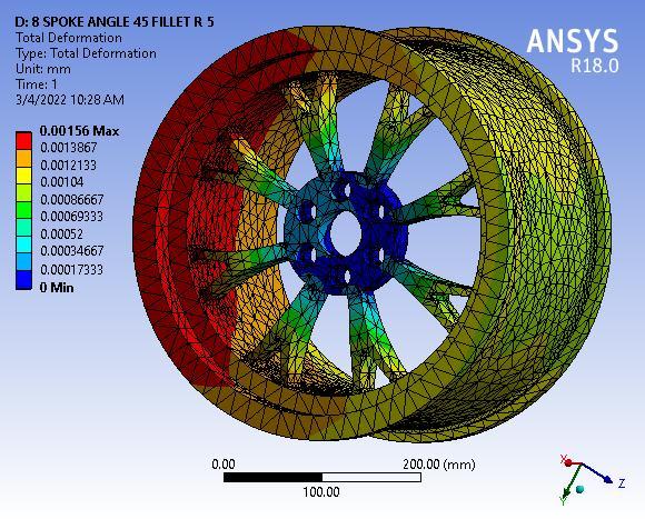Finallyresultshowsthetotaldeformationof8spokealloy wheel with 55° Y spoke angle, figure clearly depicted the totaldeformationmaximumvalue0.00155mmmaximumat baseofwheelorouterperipheryofwheelrim.