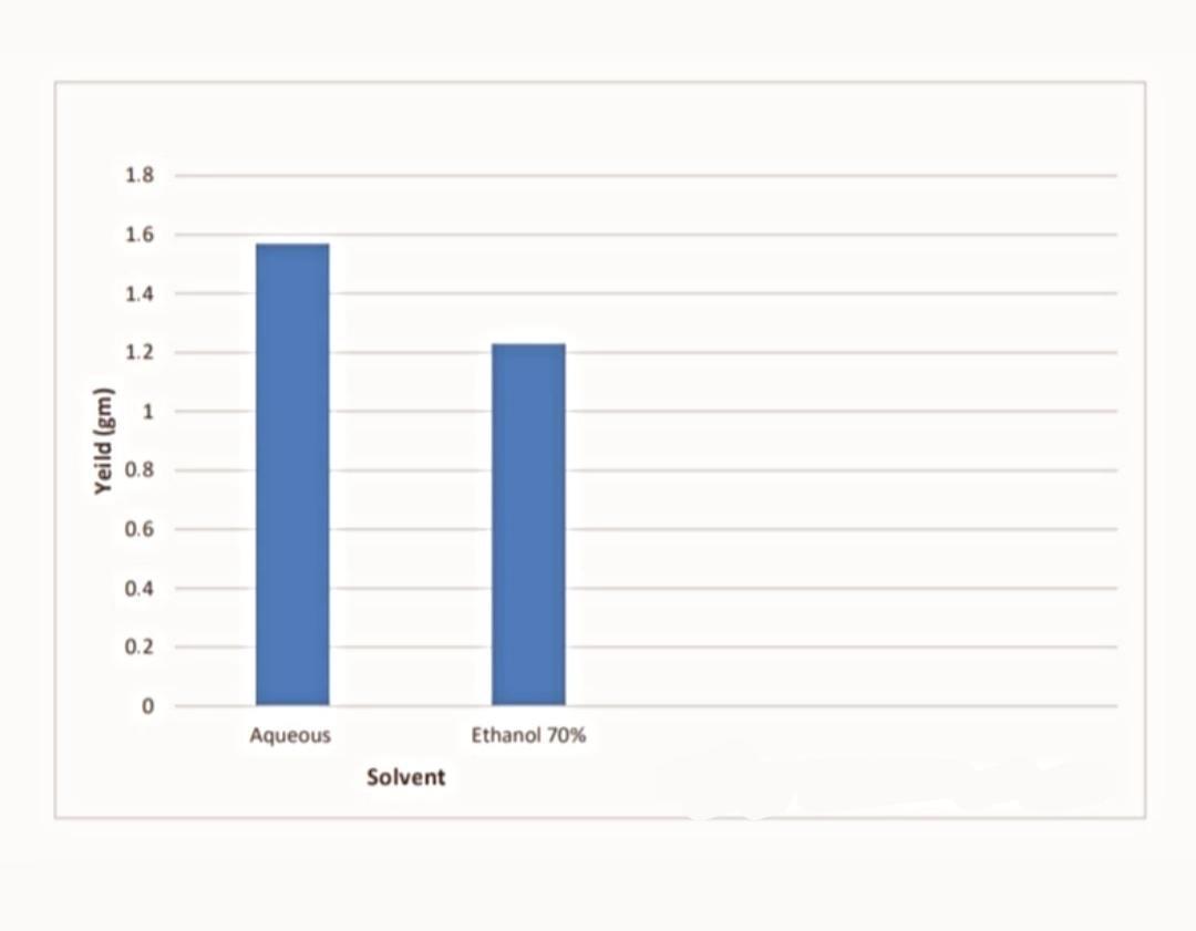 Above table and Figure 8 (below figure) show the yield of aqueous extract and Ethanol (70%) extract. 10 grams of dried piper betel leaves can produce of 1.57 grams of extract in aqueous extraction and 1.23 grams of extract in ethanol(70%) extraction [8] . The yield of aqueous extraction better than ethanol (70%) extraction because of polarity waterismorenoteworthythanethanolandthepolarsubstancesaresimplertobeextractthan nonpolarcompounds.The hydroxyl group in water and ethanol can establish hydrogen bonds with bioactive substances. “Aqueous extraction is more effective than ethanol extraction in antimicrobial compound because water has higher polarity and shorter chain thanethanol(Pinetal.,2010)”[8].Thismaybedeterminedbythecapacityofwatertoremovepolarcompoundssuchas aromaticcarboxylicacids.TheCarboxylicAcidsareakindoforganicfunctiongroupthatisveryPolar.