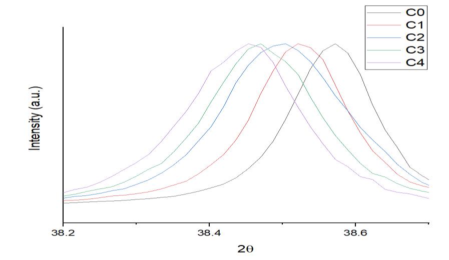 This migration of the most prominent XRD peak of alloys from its original location to its left side indicates that the lattice expansionofAl atomshashappenedasa consequenceofsolidsolutionformationwithalloyingelements(Co,Mo,Cu,Sn, Zn, Si).AstheconcentrationofCuinthesolutionrose,thelatticestructurecontinuedtogrowasseeninfigure4.