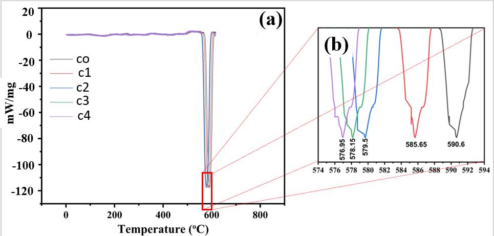 Extensive phase investigation of aluminum based alloy samples was carried out using XRD, which operates on the basis of Bragg's Law. Equipment using Cu radiation was used to conduct XRD experiments on a variety of various compositions. The analysiswascarriedoutinthe2 thetarangeof20o 80o AllXRDpeakswerefittedusingpeakfittingtogetthepeaklocations and full width at half maxima, which were then computed. Differential Scanning is a kind of scanning in which two or more images are compared side by side. For thermal examination of materials in which phase transitions such as melting, glass transitions,orexothermicdecompositionsareinvestigated,thecalorimetrymethodisutilized.Boththereferencesampleand