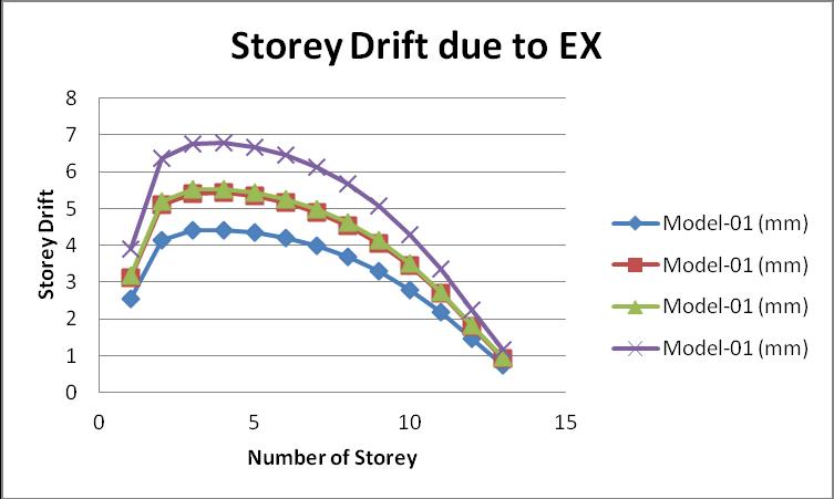 AccordingtotheIndianStandardCode1893part 01:2016, the storey drift is defined as the relative displacement betweentwofloorswhichmaybetheupperorlowerfloor. The maximum value of the storey drift should not exceed 0.004h,wherehistheheightbetweenfloors.Thegraphof thestoreydriftisgivenbelowattheloadcaseEX: