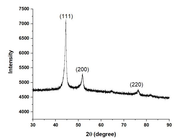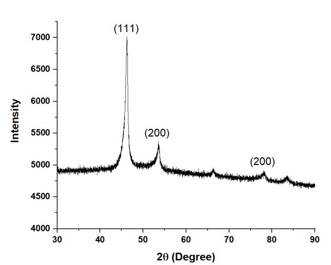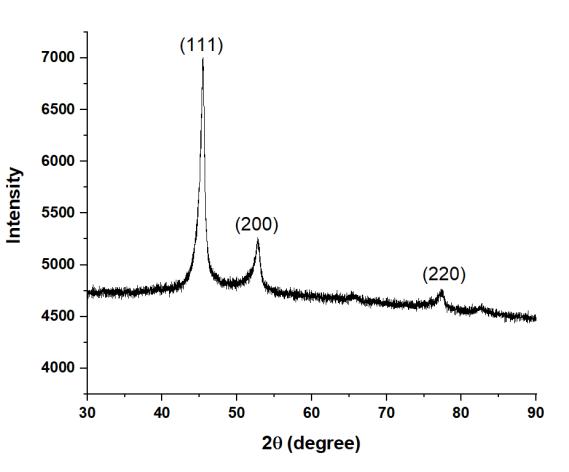 Figure1showstheXRDpatternforHEA1,indicatingtheformationofmajoritysignificantpeaksofFCCphase.Similarly,HEA2 showed mainly single FCC phase as shown in Figure 2. The XRD plots for HEA3 (Figure 3) and HEA4 (Figure 4) are almost similar.ThesignificantFCCpeaksare(111),(200),and(220).