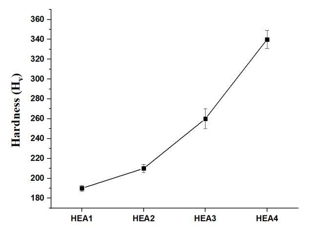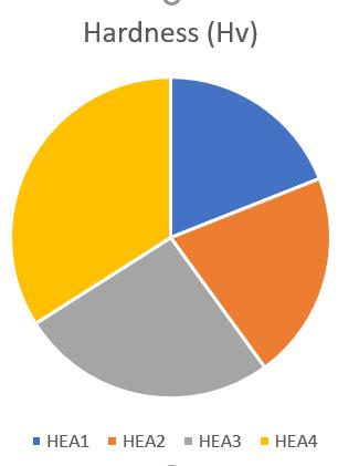 Figure 6 and Table 3 reveal the hardness of all HEAs. The percentage of Ti in alloy enhanced its hardness due to its large atomic size andimpact of solid solution strengthening.As a consequence, Ti acts as a solid solution strengthener, increasing thehardnessandstrengthofalloys.SimilarcontributionofTitohardnesshasbeenobservedinliterature[15],inwhichtheTi additiontoCoCrFeNiAl0.5increasedthehardnessvalue.