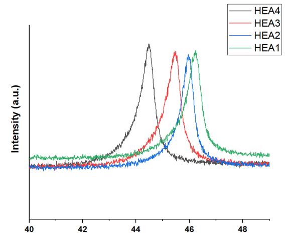 Figure5showstheleftwardshiftofthemostprominentXRDpeakfromHEA1toHEA4.Itindicatesthatthelatticeparameter isincreasingduetolargeatomicradiusofTi.ThisextensionoflatticeparametercanbeclearlyseeninTable2.