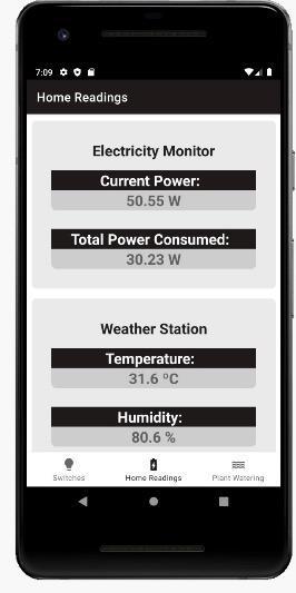 This tab displays thesurrounding weather ofthe house.It displays the temperature and the humidity of the surrounding.Itkeepsupdatingevery5secondsorso.Allthe datadisplayedontheappisstoredinthedatabaseaswell.