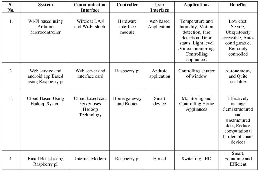 NehaMalik(2017)[6]:Theauthorgoesoverthemanytypes ofintelligenthomeautomationsystemsandtechnology.The endeavor was focused on the home automation idea, in which smart devices are used to control and monitor operations.
