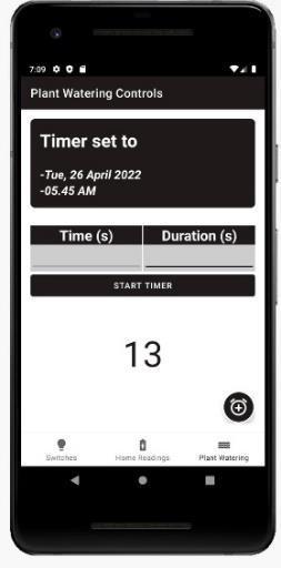 Theplantwateringtabintheappconsistsofastartbutton and a timer to water the plants as per use. The timer is designedtowatertheplantsataparticulartimeandfora particularperiod.Thestartbuttonasitstates,willstartthe wateringprocessbysendingasignaltotheesp32through thecloudandthenthewaterpumpwillstartflowingwater. Theusercanputtheamountoftimetheywanttowaterthe plantsandthenpressstarttimerbuttontoproceed.Asthe timerendsthesystemwillstopflowingwater.