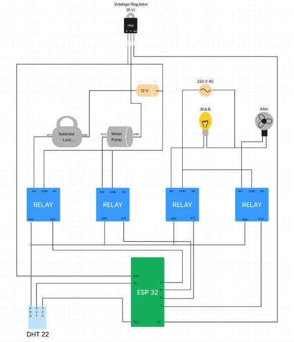Theplantwateringsystemadditionallyrequiresa watercontainer,waterpumpanda12Vpowersupply.The waterpumpwillbekeptinacontainerfilledwithwaterasit isrequiredtoflowthewaterthroughatubetotheplants. Thewaterpumprequires12Vpowersupplytooperateand thatwillbeprovidedwiththehelpofa12Vpowersupply and a relay channel. The input pin of the relay channel is connectedtoanesp32pinwhichcontrolstherelaychannel toswitchonoroffthewaterpump.