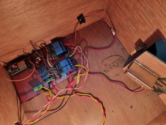 Thesolenoidlocktongueisalwaysopenwhenitis hasnotbeensuppliedanyvoltagei.e.,inzerovoltagesupply state.So,whenvoltageissuppliedtothesolenoidlockitgets triggeredanditstonguecloses.Weusezerovoltagesupply statetokeepthedoorlockedwhennotinuse.Thelockhas2 wires,positiveandnegative.Thepositivewireisconnected tothe12Vpowersupply,andthenegativewireisconnected totherelayandthisrelayisconnectedtotheesp32module. So,whentheesp32triggerstherelaypin,thesmartlockis supplied 12V and it starts operating and the door is unlocked.