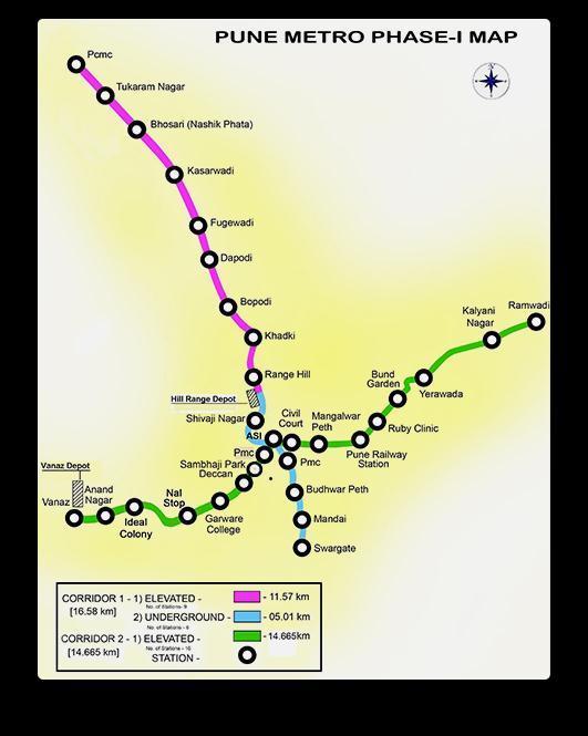 MAHA METRO has suggested two Pune Metro alignments. Lineone,fromPimpritoSwargate(with14Metrostations), is16.589kilometreslong,whereasLinetwo,fromVanazto Ramwadi(with16Metrostations),is14.665kilometreslong. TheproposedmetrorouteforLine2runsalongsomeofthe mainhighwaysinthecity,includingPaudRoad,KarveRoad, BundGardenRoad,andtheAhmednagarPuneHighway.All three lines will connect at the Civil Court interchange station'snodalstation.