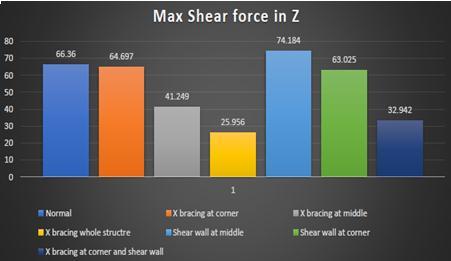 Significantreductioninshearforceisobservedincaseof structureswithXbracingsascomparedtothosewithshear walls. In structures with X bracing the best placement of bracingsamongcornerandmiddleismiddleoftheframeas observedformthegraphabove.CombinationofXbracingat cornerwithshearwallalsoreducestheshearforcebylarge amounts.