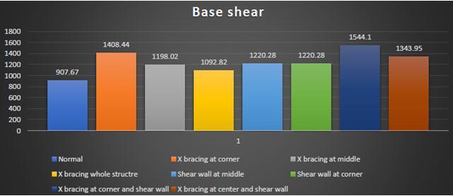 Baseshearisdependentupontheweightofstructurethatis more the weight more is the value of base shear. The minimum value is obtained in case of bear frame while maximumvalueincaseofX bracingatcorner withshear wall.Thetrendshowsthatstructureswithshearwallhave higherbaseshearascomparedtothosewithbracingsdueto moreweightincaseofshearwall.