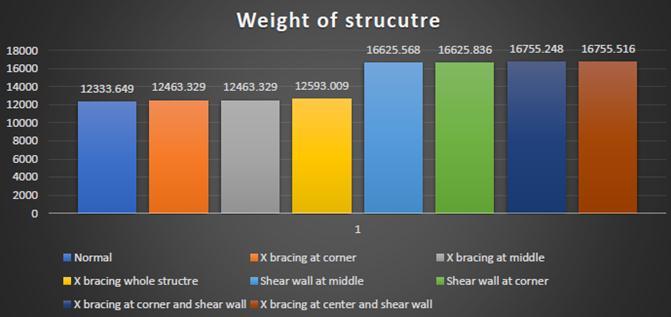 Themaximumincreaseinweightofstructureisobserved incaseofshearwallswhereasincaseofbracingsthereisno significantincreaseinweightofstructurethatagainsignifies that bracing are better seismic restraintsas the give more stabilitywithoutsignificantincreaseinweightofstructure.