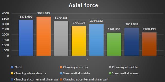 Maxaxialforcerepresenttheaxialforcethroughcolumnsat thebaseofthestructure.. Themaxaxialforceisobservedin themodelwithXbracingsandleastisobservedintheModel withshearwallsignifyingimplyingshearwallsarecapableof reducingaxialforces.