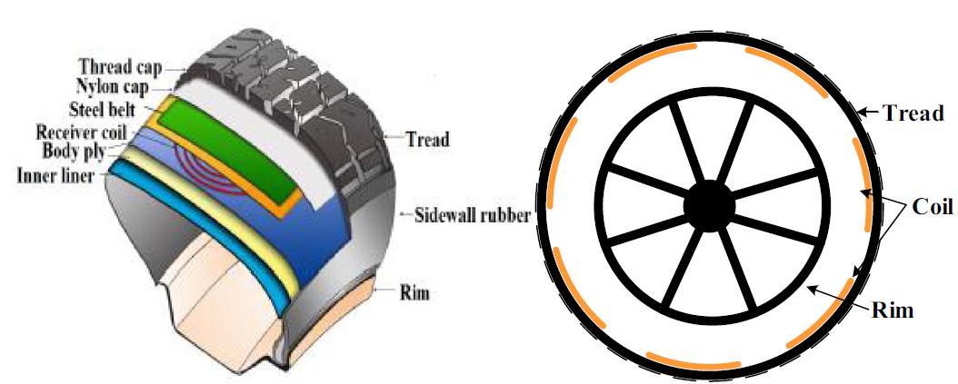 receiver coils. Inside the tyre, many receiver coils are arranged in a parallel configuration. The benefit of this design is that only the receiver coil that is in touch with the transmitter is activated. Multiple receiver coils may be triggered in some circumstanceswhenhorizontalmisalignmentoccurs.Thesearethedevicesthatdeliverelectricitytothebatterybankorload. A resonant capacitor, rectifier, and filtering circuits are all included in each receiver coil. The receiver coils array should be placedbetweenthesteelbeltandthebodyply.