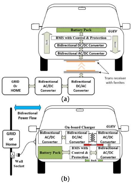 TherapidgrowthofPEVshasnecessitatedthedevelopmentofquickandefficientchargingandpowertransfertechniques.As thenumberofPEVsgrows, sodoesthedemandforelectricityfromdistributionnetworks,whichhasa negative influenceon them. Renewable energy sources (RES) have been introduced to the microgrid to compensate for the increased power demand,although theyhavelimitedsupportfacilities.Thevehicle to grid(V2G) ideacanprovideasolutionforchargingand dischargingtothedistributionnetwork,aswellasimprovedscheduling[8].Thebi directionalpowertransmissionapplication forPEVswithwirelessandplug InmodesisshowninFigure2.EVswithanon boardbi directionalchargerintheplug InV2G modeallowtheusertoconnecttothegridortotheirhouseatpeakhours. ThecarischargedfromanACwallsocketduring off peak hours. To ensure additional protection to the user, AC is converted through DC and supplied to an isolated DC/DC converter. BMS, control and protection, and a bi directional DC/DC converter are used to send converted DC to a battery. When charging the battery bank, this converter acts in buck (step down mode), and when discharging, it operates in boost mode (in order to increase power level). Figure 2 illustrates this (b). The disadvantage of this method is that it necessitates physicalcontactandhumanhandlingtochargeordischargetheelectricvehicles,whichintroducesextrariskssuchaselectric shockandtriphazards.Toaddresstheseissues,awirelessV2Ghasbeendeveloped,asillustratedinFig.2.(a).