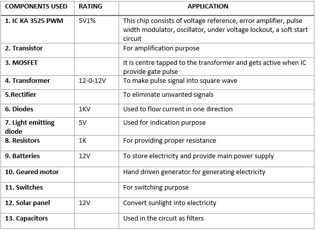 Designing of 12V to 220V(150watt) Compatible Inverter for Small Rating Appliances with Hand driven generator and Solar panel installed