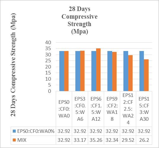 • Compressive strength result show that partially replacementofcementwithwoodashandadditionof coconutfibrethereisincreaseincompressivestrength. AfterEPS6:CF1.5:WA12volumereplacementthereis decrementofcompressivestrength.