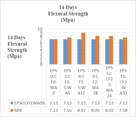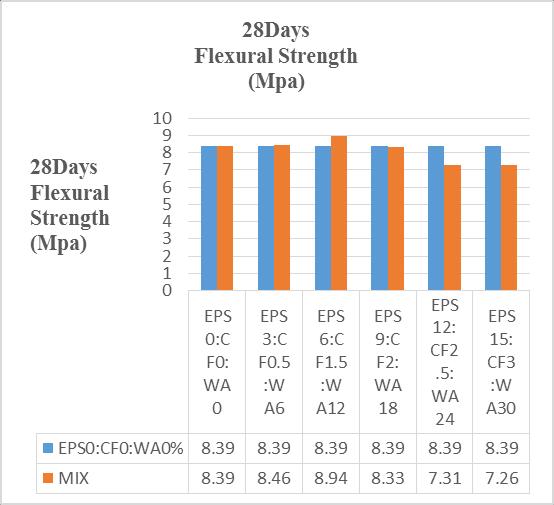 • The flexure strength also showed maximum strengthwhenEPS6:CF1.5:WA12%isbeingreplaced by Partially replacement of cement with wood ash, withadditionofepsbeadsandcoconutfibre,increased thestrengthis6.18MPAat28th day.
