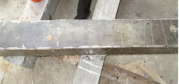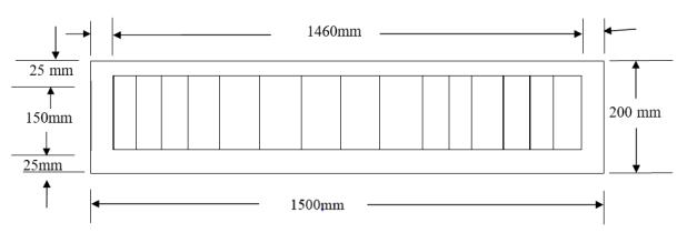 Thebeamsizeis150mmX200mmwithspanof1500mm.The grade of concrete is M25 and steel is Fe415 TMT bars. The beam has beencastbyusingOPC 43grade cement withthe water cement ratio of 0.4. For Tension and compression Reinforcement two numbers of 12mm diarod areprovided, 8mmdiarodisprovided as shearreinforcementat 100mm c/c distance.Shearreinforcementisprovidedwithtwolegs, withaleglengthof35mm.Forbeamspecimentypicalcross section drawing of beam is shown in Figure 3.2 with the details of its size and reinforcement details and its longitudinalsectioninFigure3.3.