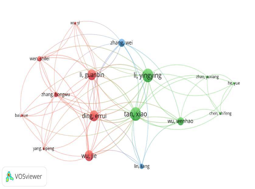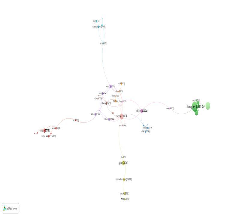 Figure 5 represents a cluster of the number of occurrences of co authors appearing among the papers. The relationshipoftheworkisshownbetweentheauthors.Thelinkrepresentstheauthors’workonthedocumentstheyhave published.Here,theminimumnumberofdocumentswassetto2,outof701authors70authorsmeetthethresholdvalue.