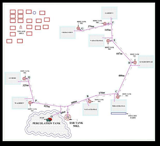 b) GravitySystemofDistributionadoptedinthepipelineto providewaterfromPercolationtankinto8strategically placedHDPETanks,using110mmHDPEPipeline