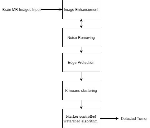 We did the image enhancement using the MATLAB function imadjust. Removing noise from the image by applying the Normal Shrink Denoising algorithm. The binomial filter technique was then used to perform edge protection on the denoised output. There are different segmentationmethodsavailableinimageprocessingsuch asedge based,threshold basedandclustering based.With asetnumberofrepetitionsandkvalues,weconstructeda k means clustering method. The output picture generated after using the k means clustering method for tumor identification is subjected to the marker controlled watershedtechnique.