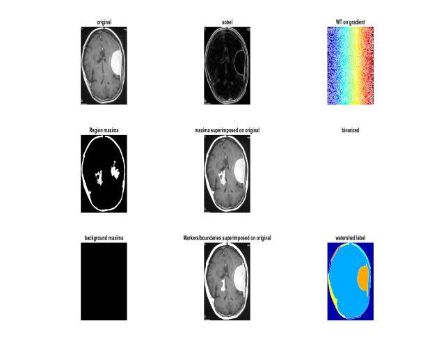 back, which are part of the dark area that should be separated.Boundariesatboththefrontandbackmarkers are necessary to create water flow, so the transition process can begin now. In order to enlarge the tumor furtherandproduceacleardistinctionbetweentumorand brain,weperformwatershedsegmentationasecondtime. We can now view the tumor as the original black and whiteimagebecausethethresholdwas255forthetumor and 0 for the rest. We were able to identify the markers anddefinetheboundariesaccuratelybyreconstructionby repeated opening and closing, ensuring that there was no disaggregation. Superimposition was employed [19] to enhance contrast and ensure that borders were not highlightedwithclear tumorsvisibleagainstapitch black background.