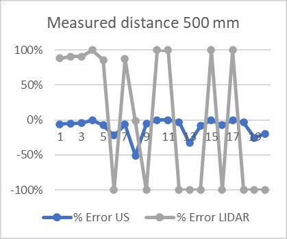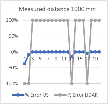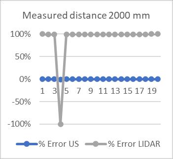 The graph in Fig. 10 shows that an ultrasonic sensor can measurethedistanceof2000mmwitha0%measurement errorfortwentymeasurementsoftheexactlocation.Onthe other hand,theLIDAR sensor hasa measurement error of about100%.