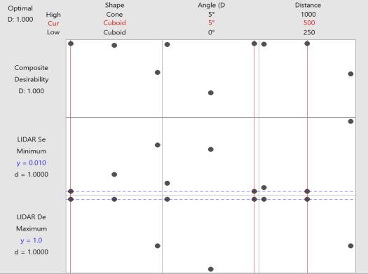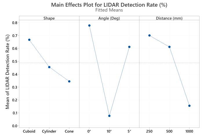 The graph in Fig. 18 shows that in the LIDAR sensor, to maximise the object detection rate and minimise the measurementerrorrate,theoptimalsettingsareanobjectof cuboidshape,anglevalueof5°anddistancevalueof500mm, respectively.