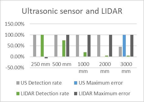 ThegraphinFig.12showsthattheultrasonicsensorhasan almost negligible measurement error for a distance up to 2000mmandhasa100%measurementerroratadistanceof 3000mm.Second,theLIDARsensorhasanalmostnegligible measurementerroruptothedistanceof250mmandhasa 100% measurement error for the other distance values. Third,theultrasonicsensorhasa100%objectdetectionrate for distances up to 2000 mm and around a 40% object detectionratefordistancevaluesof3000mm.Fourth,the LIDARsensorhasobjectdetectionratesof100%atadistance of 250 mm, approximately 75% at a distance of 500 mm, about 25% at a distance of 1000 mm and below 5% for remainingdistancevalues.